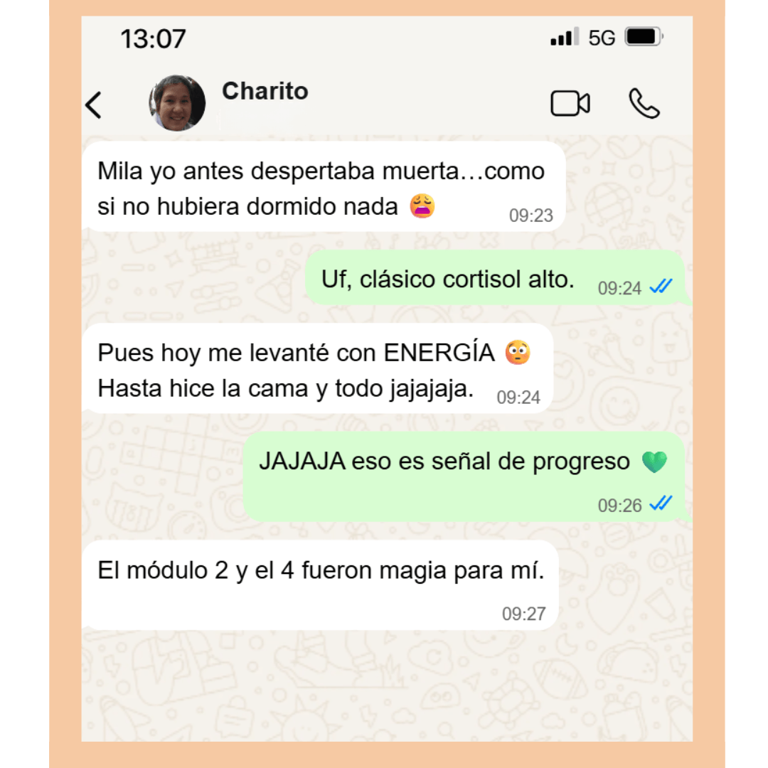 El resultado es integral, tendrás menos cansancio, menos hinchazón, mejor sueño, mente más ligera y una sensación profunda de bienestar. Alimentarte con presencia y calma es una de las formas más poderosas de bajar el cortisol y recuperar tu verdadera energía.